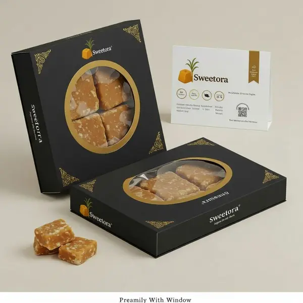 The see-through circle allows customers to glimpse the golden jaggery blocks inside — their crystalline texture, handcrafted perfection, and natural color. This transparency doesn’t just enhance visual appeal; it communicates trust. It says, “We have nothing to hide — our purity speaks for itself.”