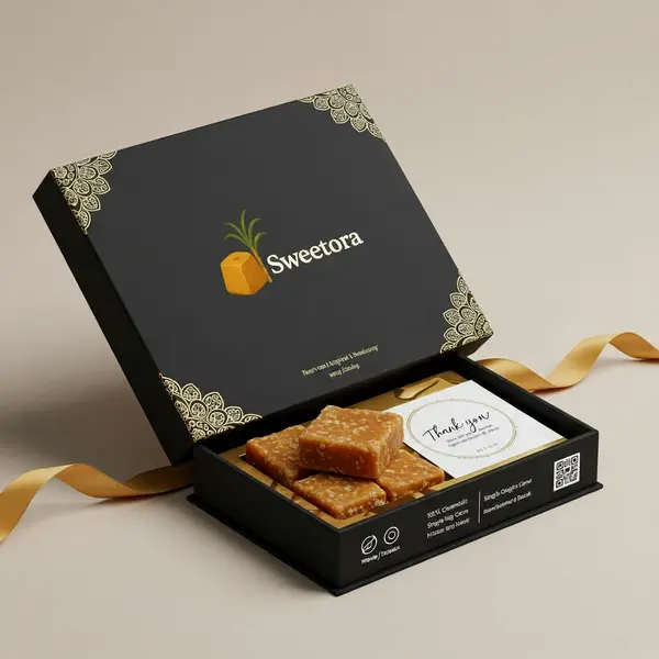 Inside, the jaggery blocks are carefully arranged in gold-toned compartments — a nod to fine confectionery design. The overall unboxing experience has been crafted to evoke delight, gratitude, and authenticity — feelings Aymaura believes belong to every Sweetora moment.